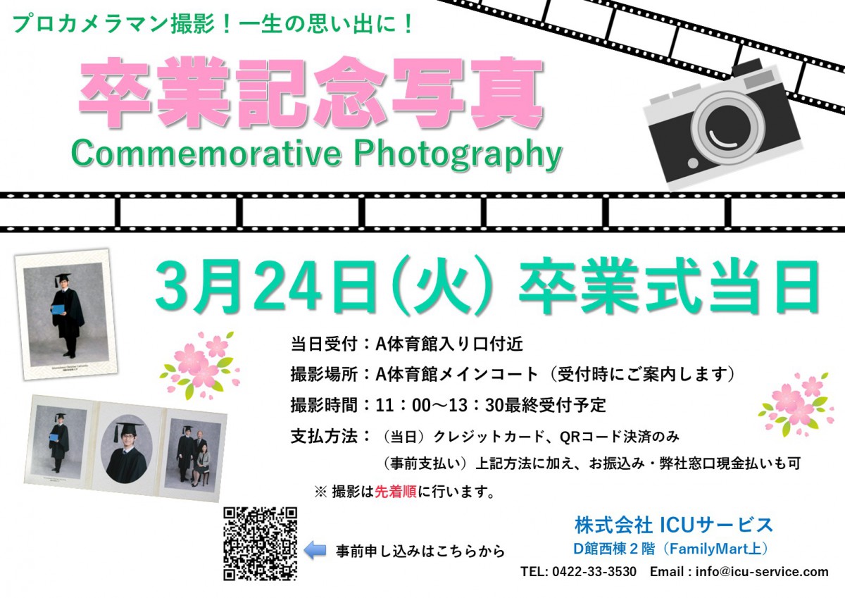 詳しくは 卒業写真のページをごらんください。https://www.icu-service.com/services/professional-photography/