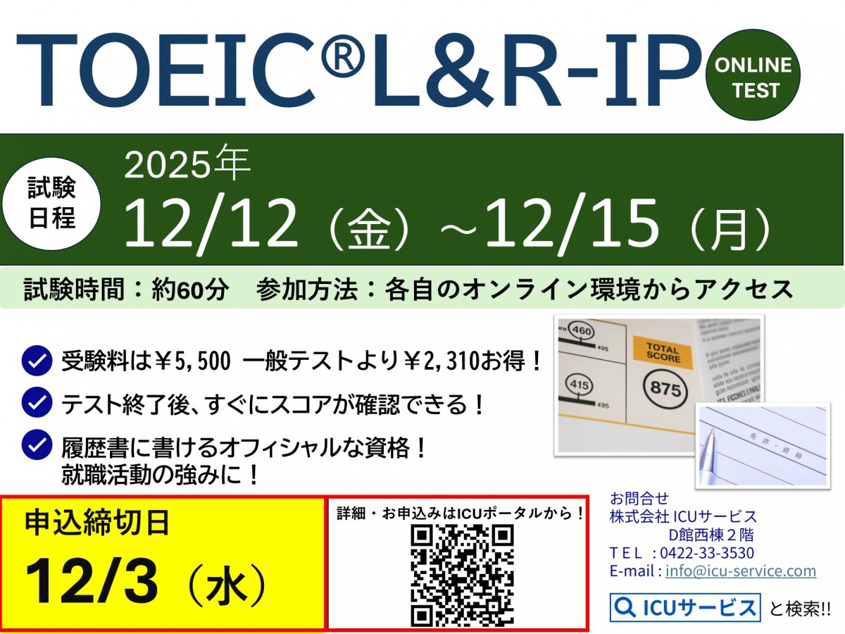 お申し込み:TOEIC L&RオンラインIPテストのお知らせ(ICU在籍者対象) – ICU TOEIC TEST 申込URL