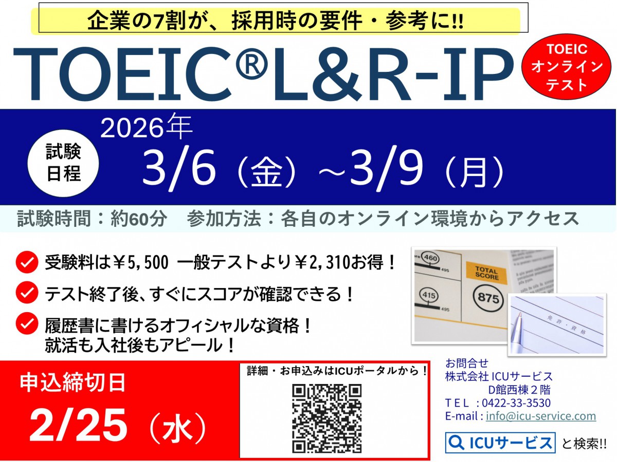 お申し込み:TOEIC L&RオンラインIPテストのお知らせ(ICU在籍者対象) – ICU TOEIC TEST 申込URL