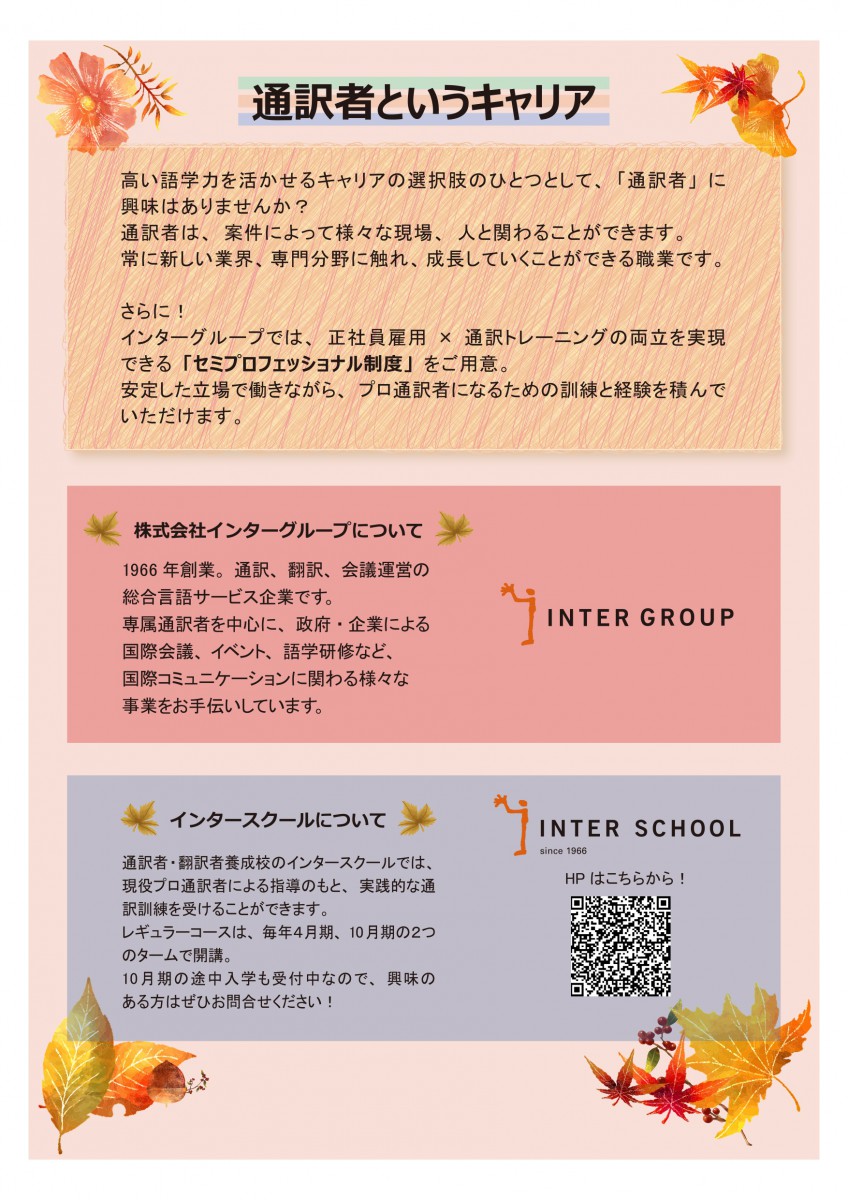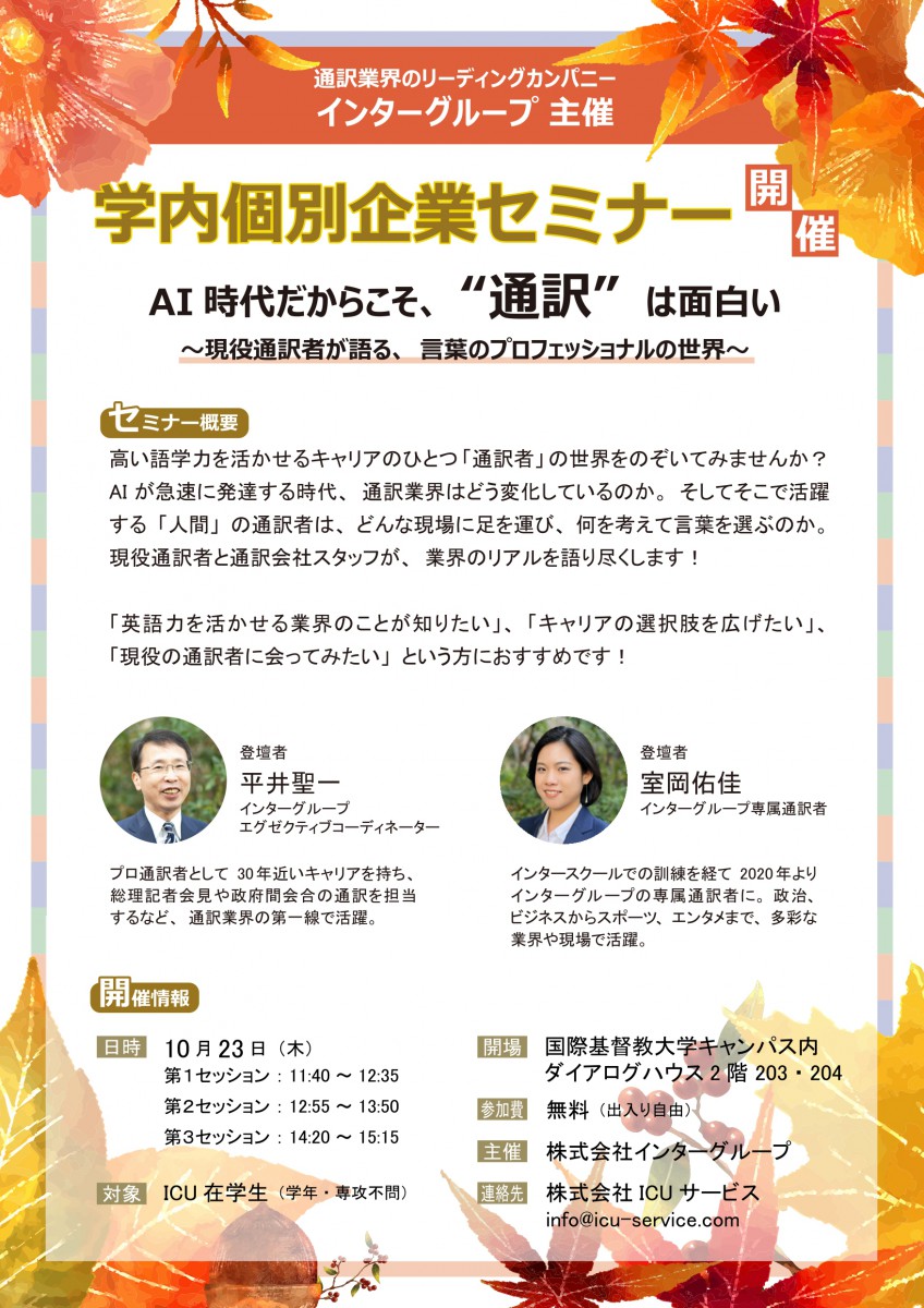 通訳業界のリーディングカンパニー インターグループ様の 個別企業セミナーが開催されます。