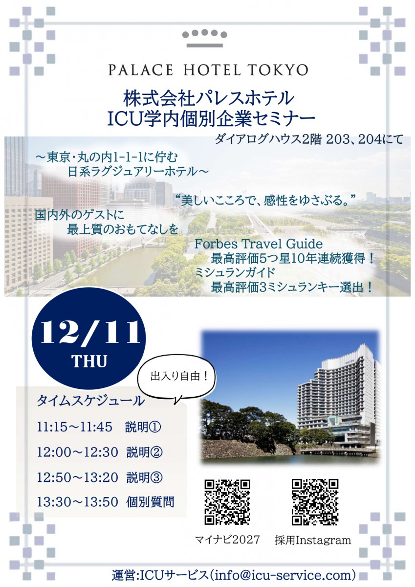 国内外のゲストに最上質のおもてなしを提供している「株式会社パレスホテル」が、ICU学内にて個別企業セミナーを開催します!