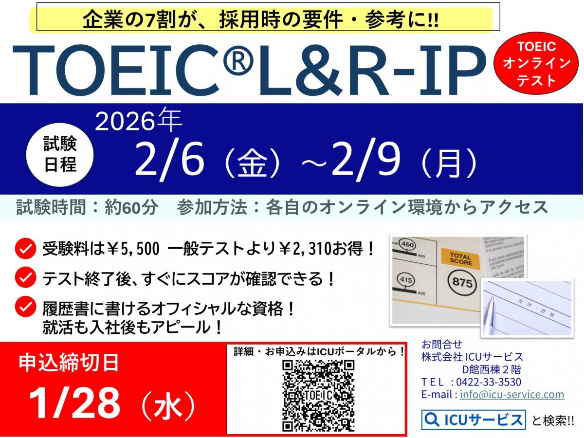 お申し込み:TOEIC L&RオンラインIPテストのお知らせ(ICU在籍者対象) – ICU TOEIC TEST 申込URL